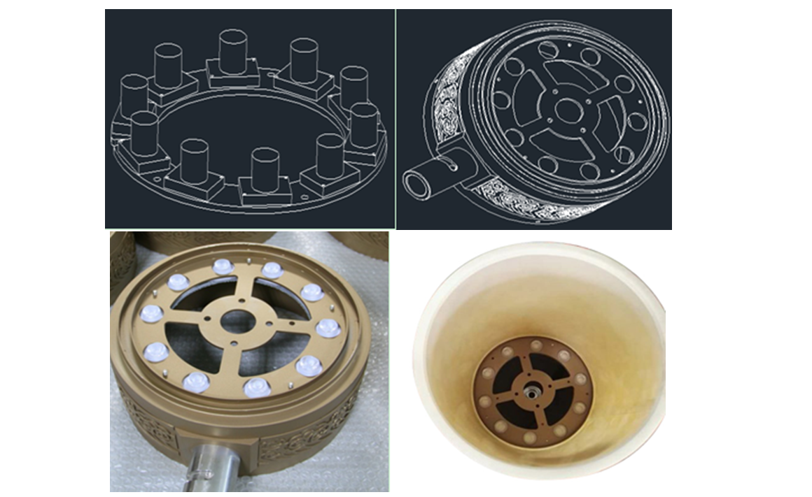 中間部分的LED光源,主要是保證燈筒的裝飾照明,由于燈筒為玻璃材質,且上照光源下沉,要保證通體均勻發光,存在很大的難度。對此LED研發團隊反復研究燈筒結構,獨特提出了側發光配光方案,為此燈筒開發了側發光LED小模塊,此小模塊選用Cree XPG2大功率燈珠,防護等級為IP66,并通過小模塊的組合應用,每個燈筒采用10個小模塊,采用由下而上的照射方式,巧妙的解決陰影,達到通體均勻發光的照射效果。并且由于采用模塊化設計,維護方面非常方便。