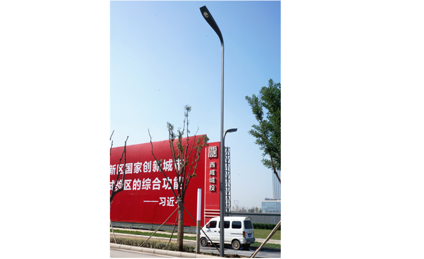 183套雙葉燈則安裝在西咸城投集團門口道路——上林路。雙葉燈,是以象征禮節的“茶葉”為元素,融入現代簡潔的線條,時尚有韻味。燈頭采用茶葉瓣的形式,實現了燈桿與燈頭的實體連接,兼顧功能照明和景觀照明。